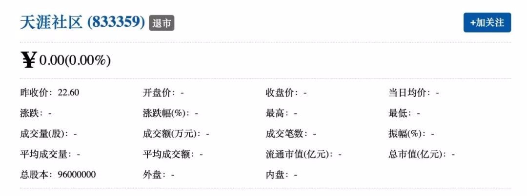 实际上挂牌以来,天涯社区二级市场交易并不活跃,且申报审批并未通过。2018年4月8日,董事会审议通过终止挂牌的议案。2019年4月17日,天涯社区正式在新三板摘牌。